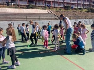 El viernes, 14 de febrero de 2025, los alumnos de primero de Primaria y los de Preescolar se reunieron en la cancha para disfrutar juntos del primer día del proyecto conjunto sobre el tema «Deportes».