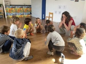 Dos veces al mes, los niños del grupo Preescolar de los leones juegan al teatro. Las clases de teatro del grupo de Preescolar de los leones son una valiosa experiencia para los niños. Contribuyen significativamente al desarrollo de sus capacidades lingüísticas, sociales y creativas. Además, las clases de teatro son siempre muy divertidas para los niños, lo que contribuye aún más a su desarrollo positivo y a que disfruten aprendiendo. La participación regular en las clases de teatro tiene efectos positivos de gran alcance en el desarrollo de los niños: