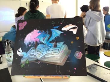 Die Schüler und Schülerinnen der 11. Jahrgangsstufe durften in den vergangenen Wochen ein Mixed Media-Gemälde anfertigen. Dabei wurden die Unterschiede zwischen verschiedenen Gemäldetypen (Malerei, Multimedia, Collage, Combine Painting, etc.) gelernt. Ebenso wurden verschiedene Techniken und Materialien – teils auch unkonventionell – kennengelernt und ausgetestet. Begleitet wurde die Praxis mit theoretischem Input aus der gegenwärtigen Malerei. Den Schüler*innen wurde die Freiheit gelassen, sich mit einem selbst gewählten Thema auseinanderzusetzen und dieses visuell umzusetzen. Ob nun Farbe gekippt (Drip Painting), gesprayt, Objekte installiert oder Sand aufgeklebt wurde, es sind fantastische Ergebnisse entstanden!