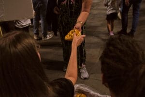 Am Ende des Umzugs kehrten alle zum Plaza de Santa Ana zurück, wo das Teilen symbolisch in die Tat umgesetzt wurde. Es wurden süße Brezeln nach deutschem Rezept verteilt, die die Gäste in zwei Hälften brachen und mit den Anwesenden teilten. Diese Geste des Teilens, die das Herzstück der Sankt-Martins-Legende darstellt, wurde mit Freude aufgenommen und brachte die Gemeinschaft zusammen.