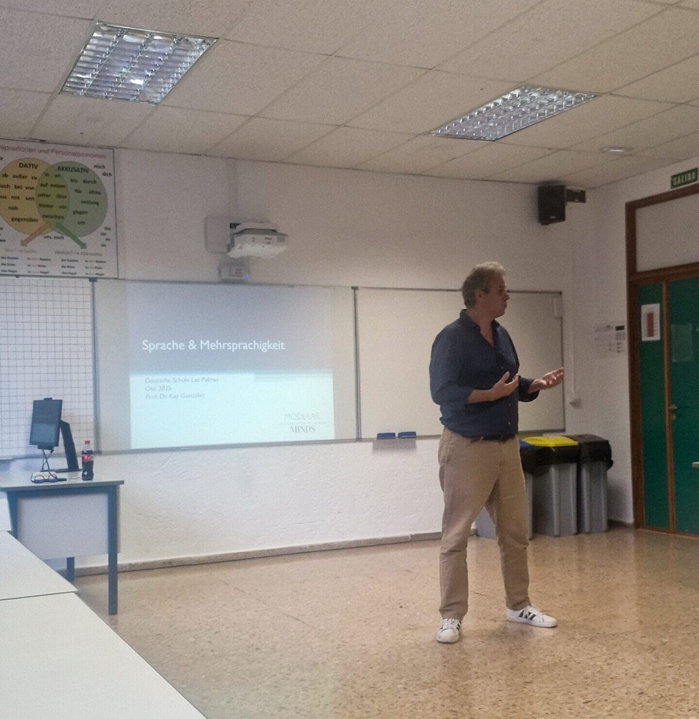 In der vergangenen Woche fand eine interne Fortbildung für die Praktikant*innen des Kindergartens/der Vorschule zum Thema „Sprache und Mehrsprachigkeit“ statt. Der Sprachwissenschaftler Prof. Dr. Kay González erklärte ihnen den biologischen Hintergrund von Spracherwerb im Kindesalter. Die Praktikant*innen erfuhren interessiert mehr dazu, wie Sprache funktioniert und sich der Spracherwerb, insbesondere bei